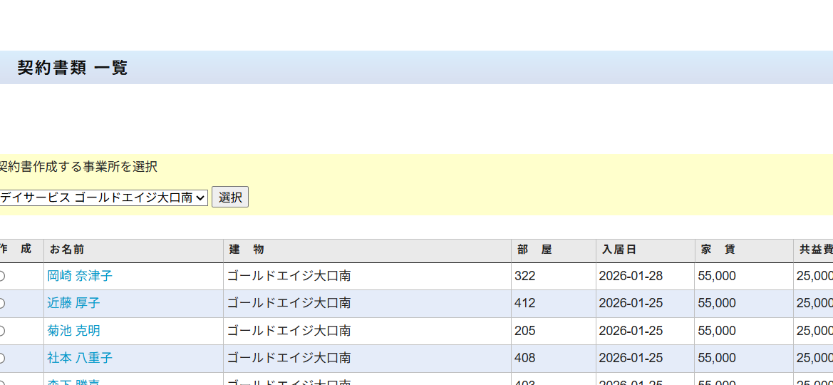 お問い合わせありがとうございます。契約書類の事業所リストはログインしているスタッフのアクセス権限事業所や登録されている事業所が表示されます。従業員表示画面で事業所を登録すればリストに追加されます。どうぞよろしくお願いいたします。