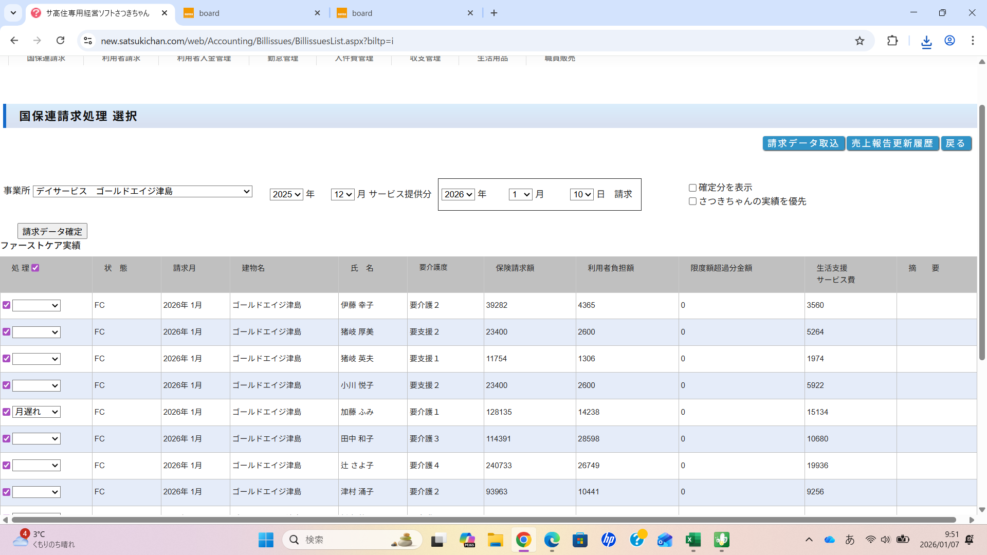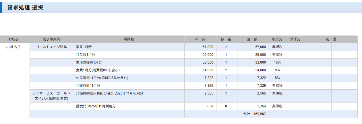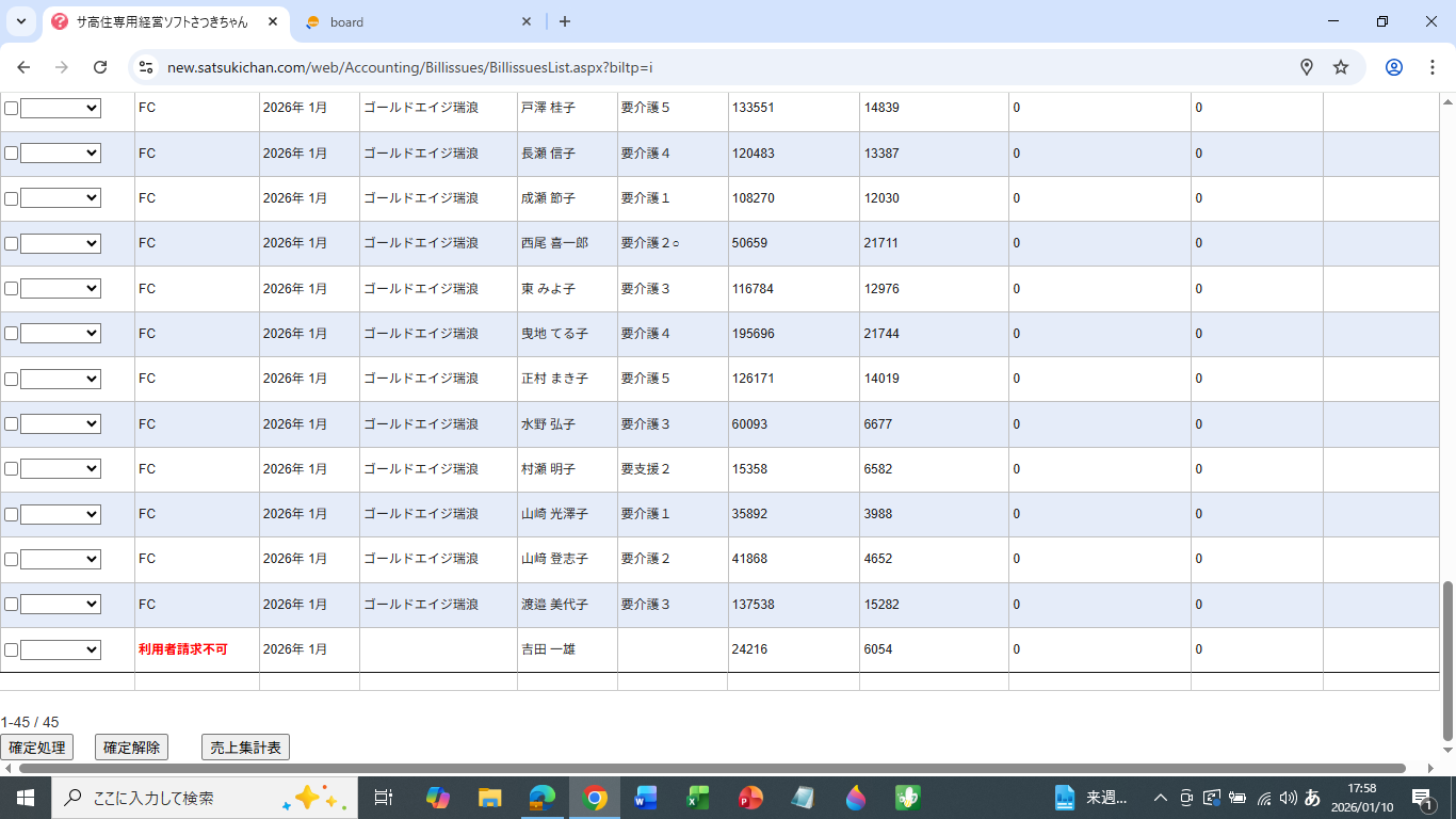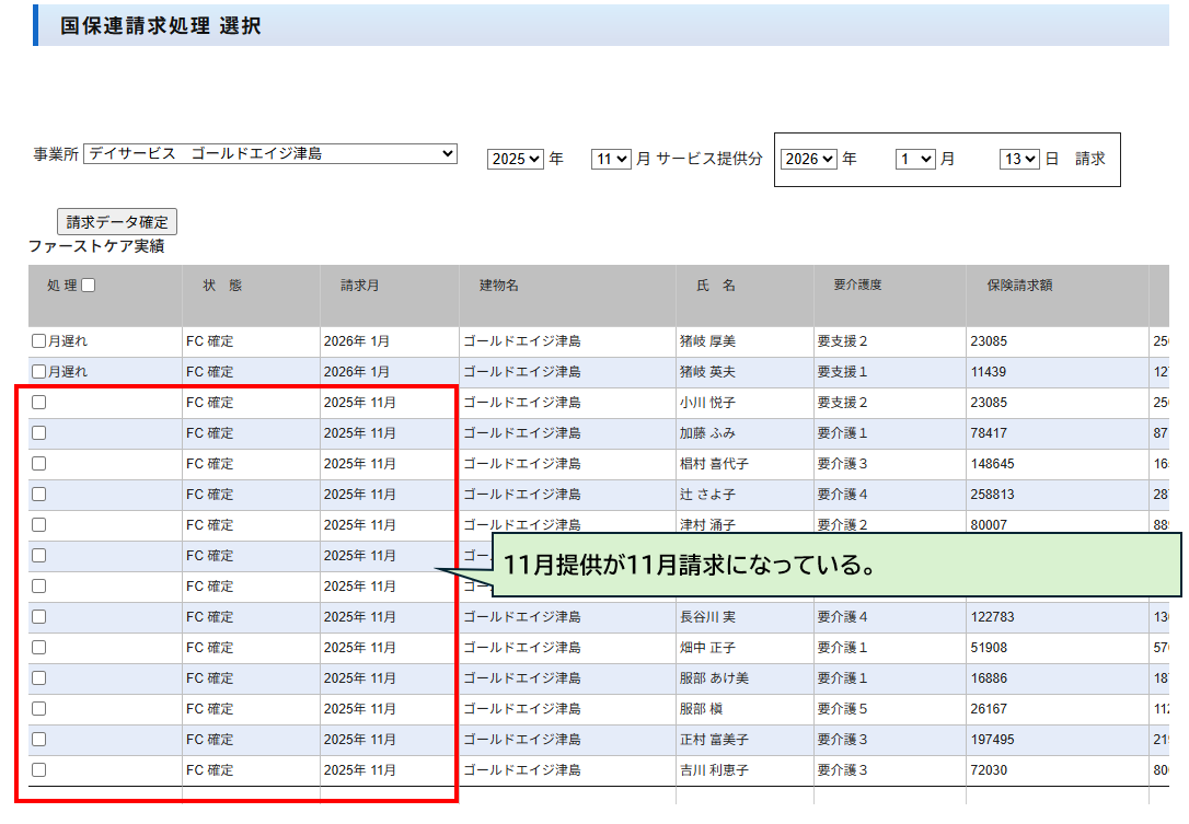 お問い合わせありがとうございます。請求は確定処理をしていない場合は、提供月⇒次の月が請求月で処理するようになっています。添付画像の2026年1月提供月⇒2026年2月請求月は確定処理する必要がないため登録がされません。どうぞよろしくお願いいたします。