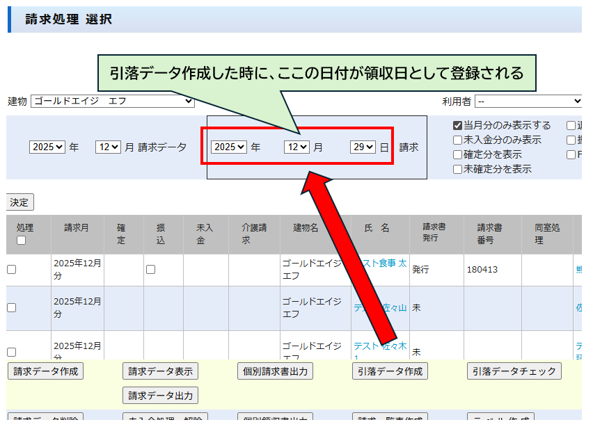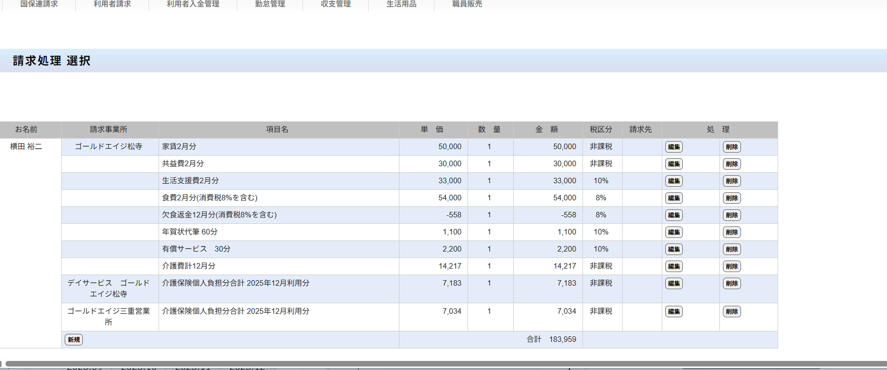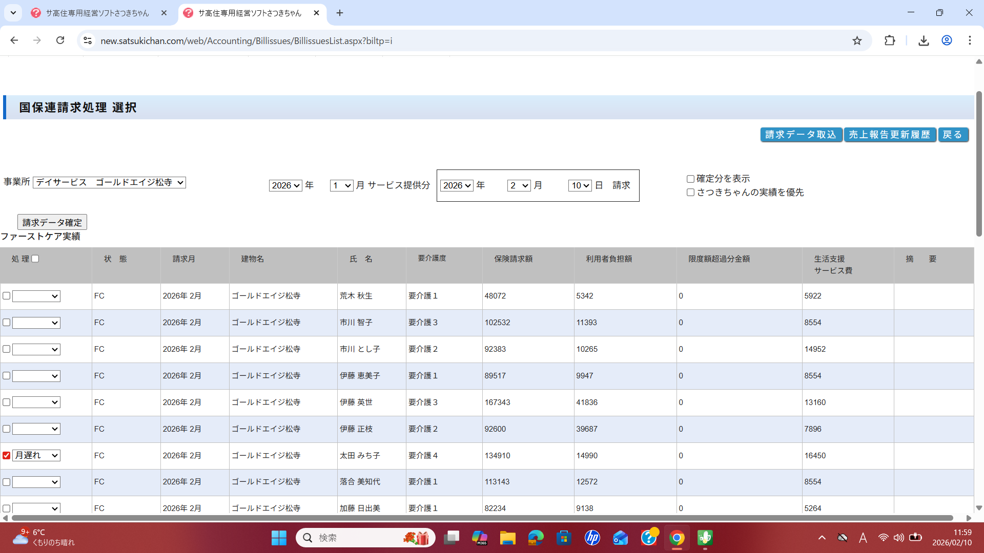 お問い合わせありがとうございます。請求は確定処理をしていない場合は、提供月⇒次の月が請求月で処理するようになっています。添付画像の2026年1月提供月⇒2026年2月請求月は確定処理する必要がないため登録がされません。どうぞよろしくお願いいたします。