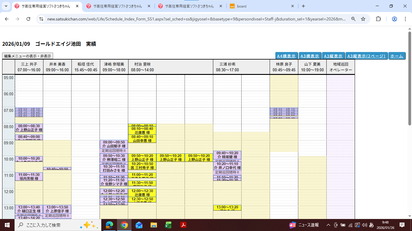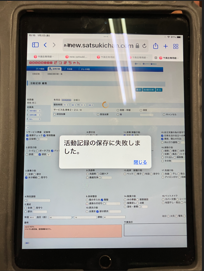 訪問介護の活動記録ですが左側の呼出ボタンを押すと以前のような当日の利用者一覧の画面ではなくほとんど空白です(一人入力表記されているのは、ネット接続の方から入力保存したため)他訪問介護員でも同じ状況です