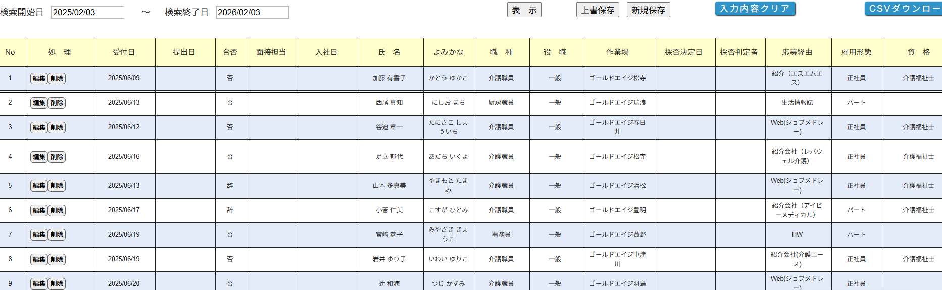 お世話になります。基本データ→採用管理で少し下へスクロールしたところにある登録済みの方々の一覧ですが、この並び順序は登録した順番に最下段へ追加される規則でしょうか? 受付日、提出日、入社日は関係なく新たに登録されると最下段に順次追加される、という事でしょうか?
