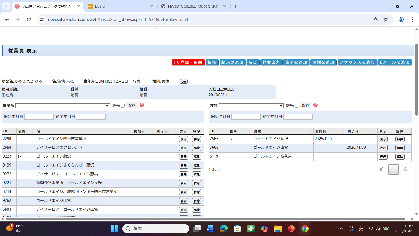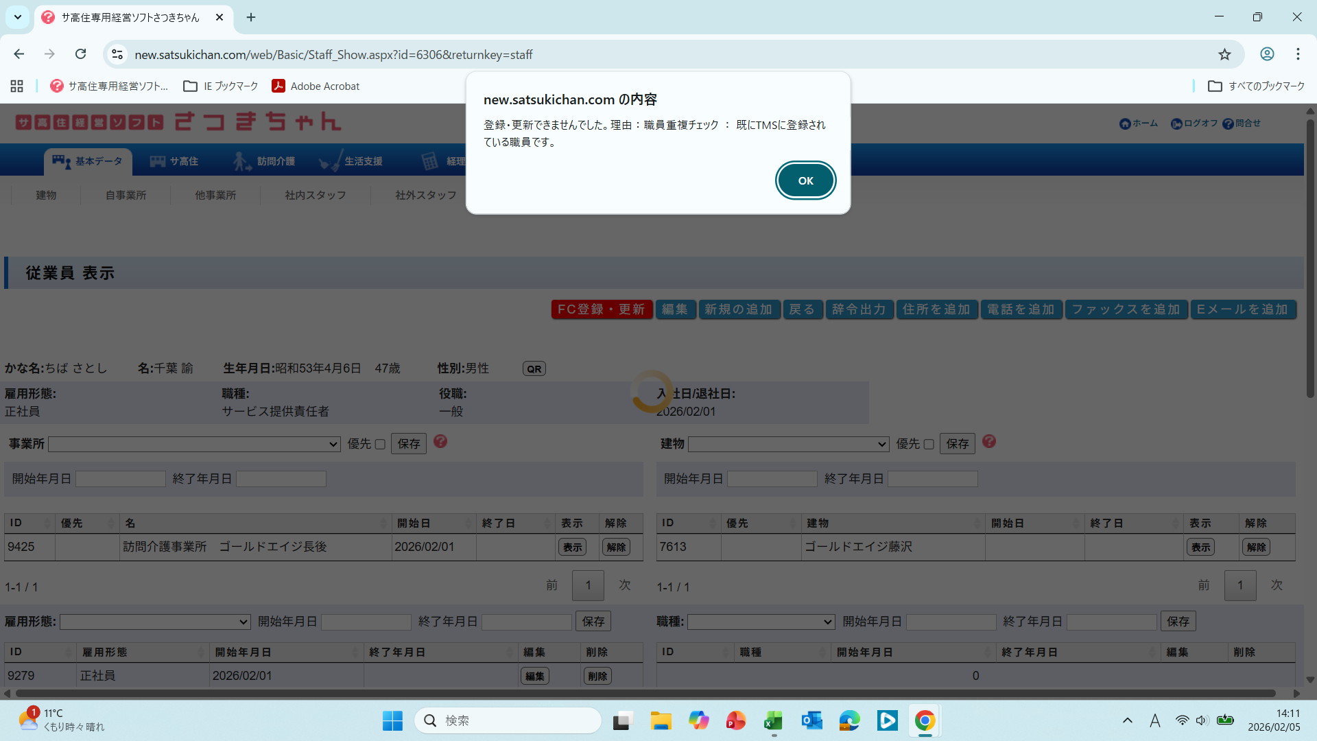 お世話になっております。職員の千葉諭さんをファーストケアに追加したいのですが、既に登録されていますと表示されます。昨年の6月に退職し、2月1日に復職した人です。どのようにすれば宜しいでしょうか。また、退職した職員をファーストケア上で削除してしまったのですが、システム上良くなかったでしょうか。無効にすれば問題なかったのでしょうか。