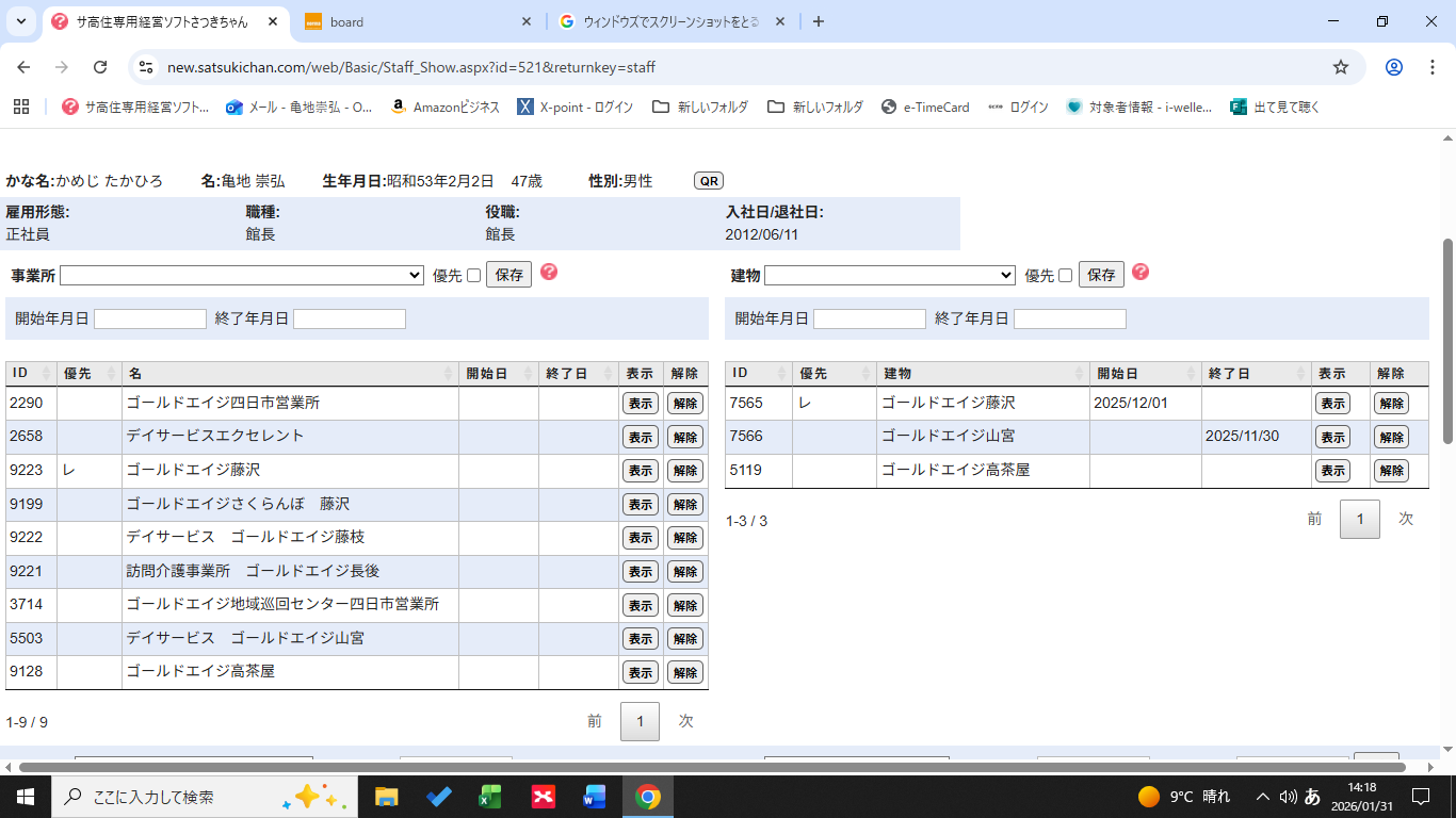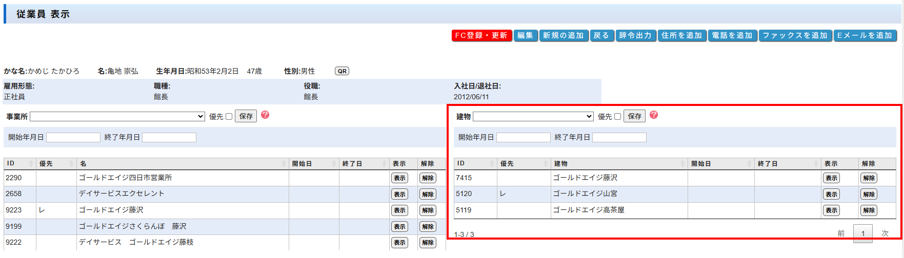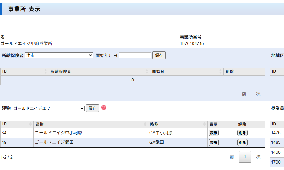 二又川様のアクセス権限が「ゴールドエイジ甲府営業所 カスタム」で登録されています。事業所「ゴールドエイジ甲府営業所」に登録されている建物は「ゴールドエイジ中小河原」と「ゴールドエイジ武田」です。(添付画像)事業所表示画面で事業所「ゴールドエイジ甲府営業所」に「ゴールドエイジ山宮」を追加すれば建物リストに表示されます。どうぞよろしくお願いいたします。