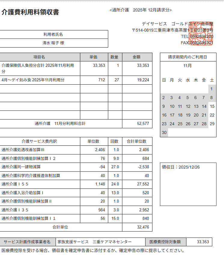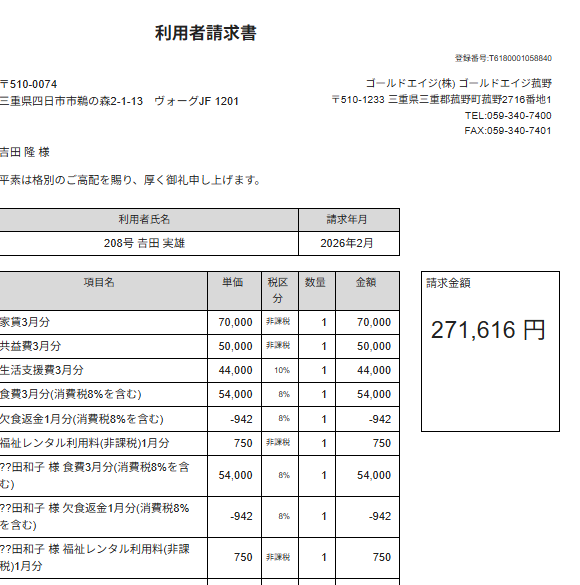 お世話になります。2月の利用者請求で「建物:ゴールドエイジ菰野」「𠮷田 実雄様・和子様」の請求書について、和子様を合算しています。請求書に「??田和子 様 」と表示されるのはなぜでしょうか。「𠮷田実雄様」と同じ漢字を使用しています。来週請求書発送致しますので、お手数ですが早急にご確認頂きますようお願い致します。