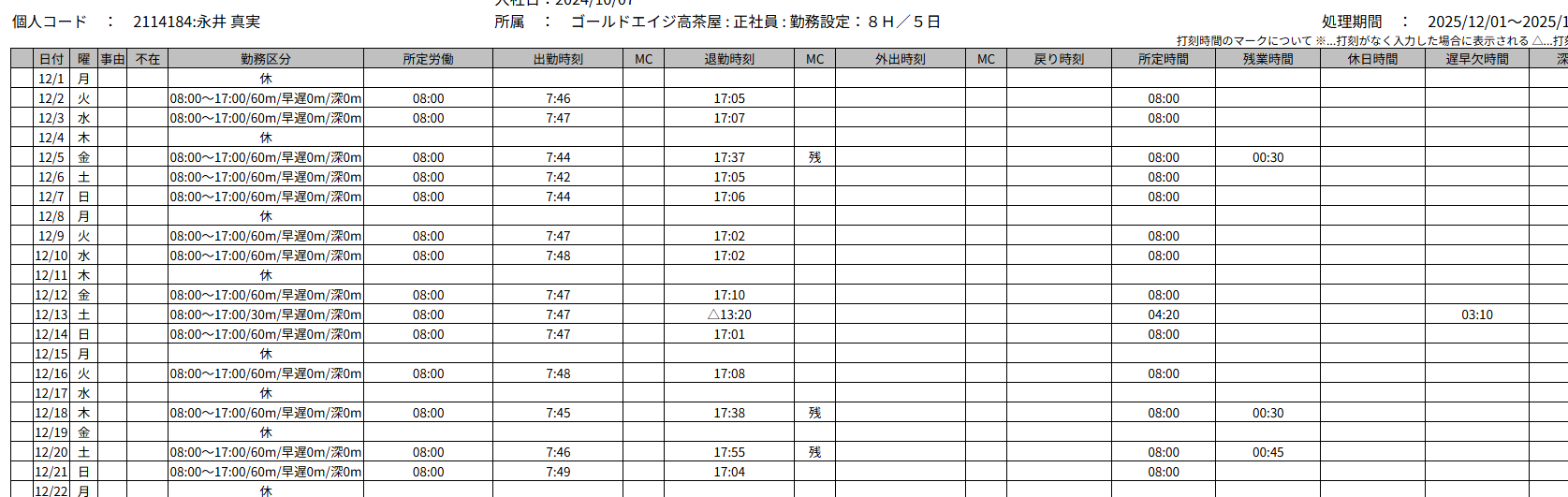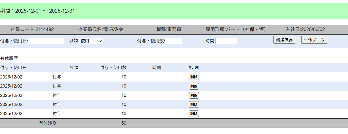 社員番号2110681 野久保登志子さんの有休残日数が「-48」となっていますので、ご確認をお願いいたします。