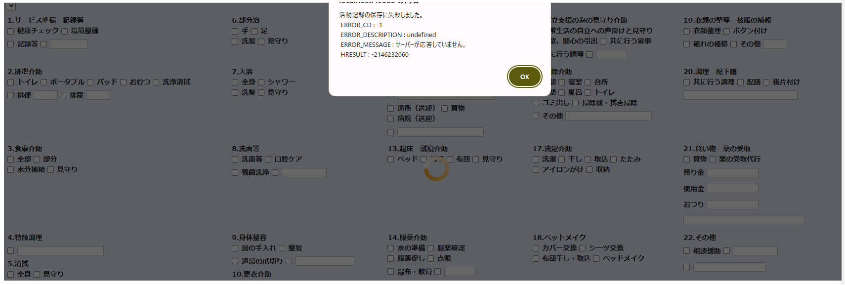 以前作成した通所計画書とモニタリングのデータがありません。新しく作成して保存を押してもエラーがでます。