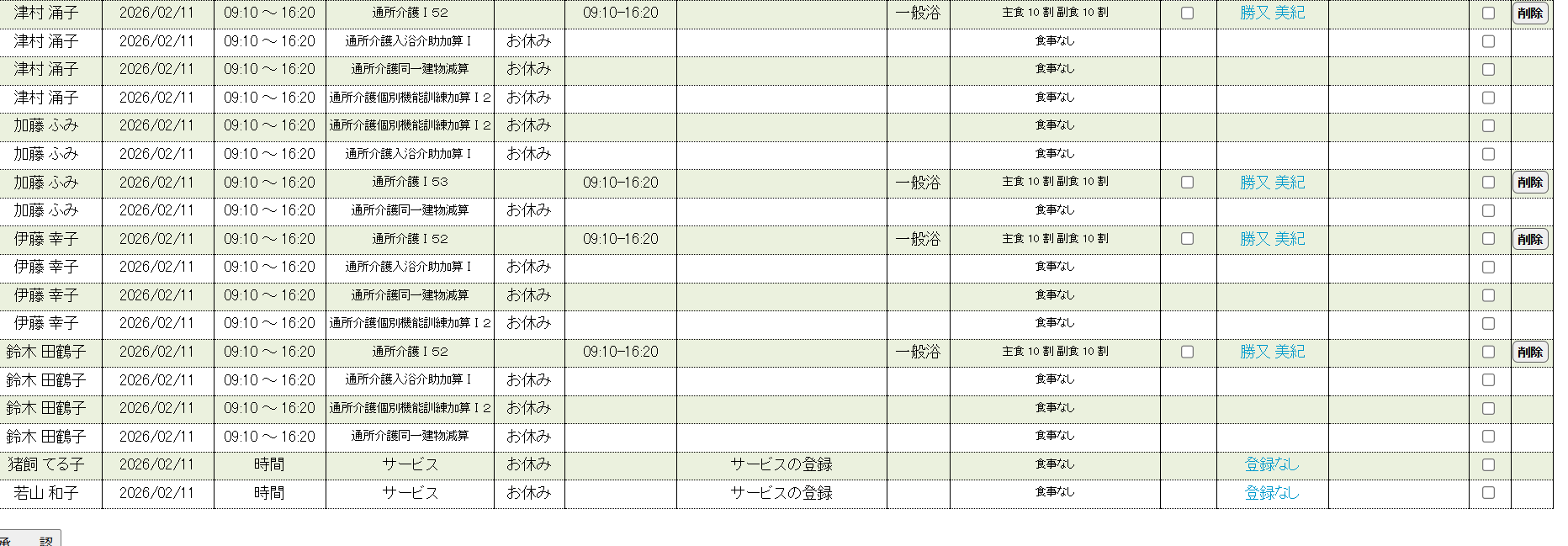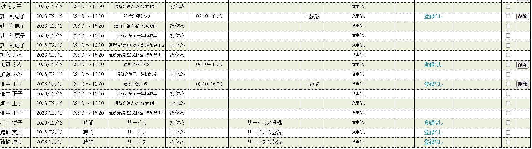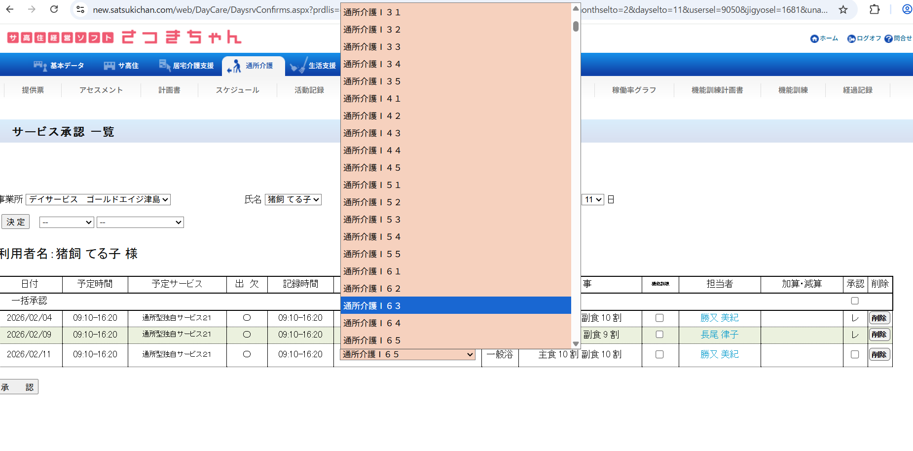 お世話になりますさつきちゃんにて、活動記録承認する際、要支援の方が名前のみで他のところ(予定時間、予定サービス、記録時間、入浴、食事の欄が空白になります。実績サービスの欄に「サービスの登録」と出ています。提供票にて自ら実績をⅠ立てすると承認されていますが、介護の方と一緒に反映するにはどうしたらいいのでしょうか