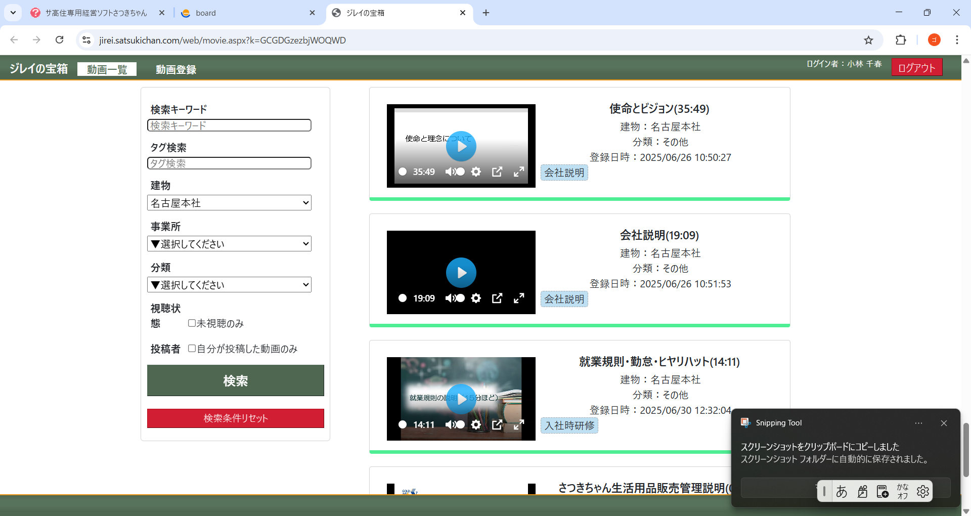 ご相談です。ジレイの宝箱で添付の3つの動画について、定期的に行う新人研修に参加できなかった新スタッフが視聴されます。「使命とビジョン」「会社説明」「就業規則・勤怠・ヒヤリハット」の3項目となりますが、動画が探しにくく感じます。建物を名古屋本社にするとある程度絞り込みができて、下の方にスクロールしていくと見つかるのですが今後動画が増えてくるとこの方法も使いにくくなってくるのではと思っています。 検索キーワードはヒットしません。 効率的に動画を探す方法か、この3つを別枠で掲載させてもらうなど、何か方法はないでしょうか? 従業員が多いので今後もこの動画をたくさんの方に視聴してらわないといけません。その発信の担当者に私がなりましたので、受講者にわかりやすく案内したくご相談させていただきました。 ご提案などいただければと思います。